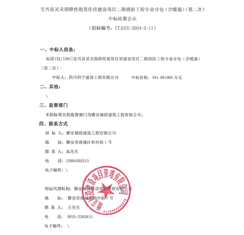寶興縣靈關(guān)保障性租賃住房建設(shè)項目二期消防工程專業(yè)分包(含暖通)(第二次)中標(biāo)結(jié)果公示