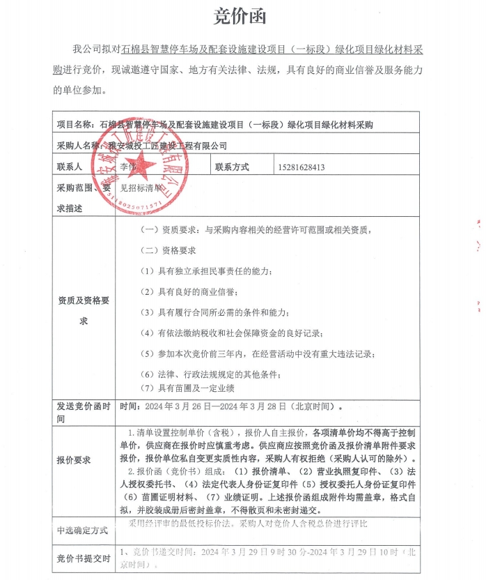 石棉縣智慧停車場及配套設(shè)施建設(shè)項目(一標段)綠化項目綠化材料采購競價公告