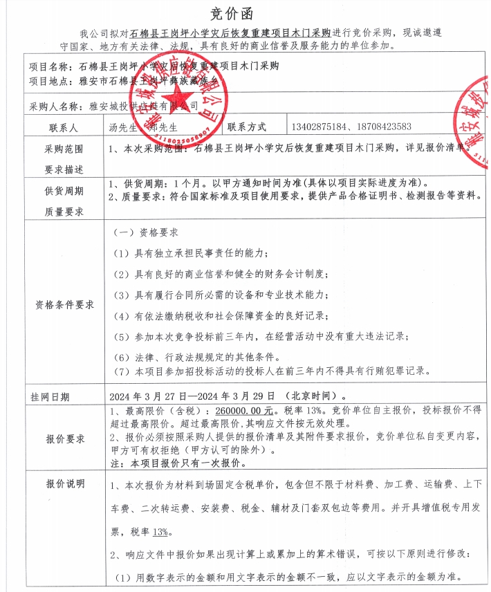 石棉縣王崗坪小學災后重建項目木門采購競價公告