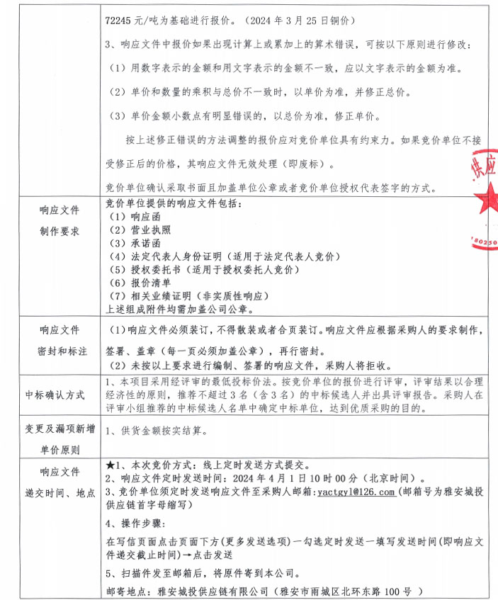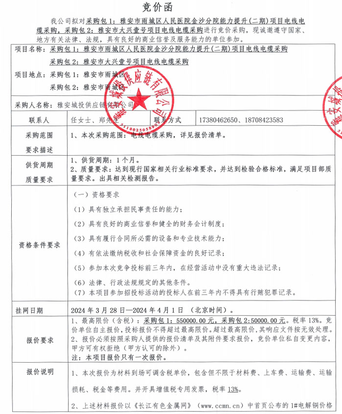 雅安城投供應鏈有限公司電線電纜采購競價公告