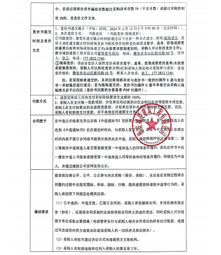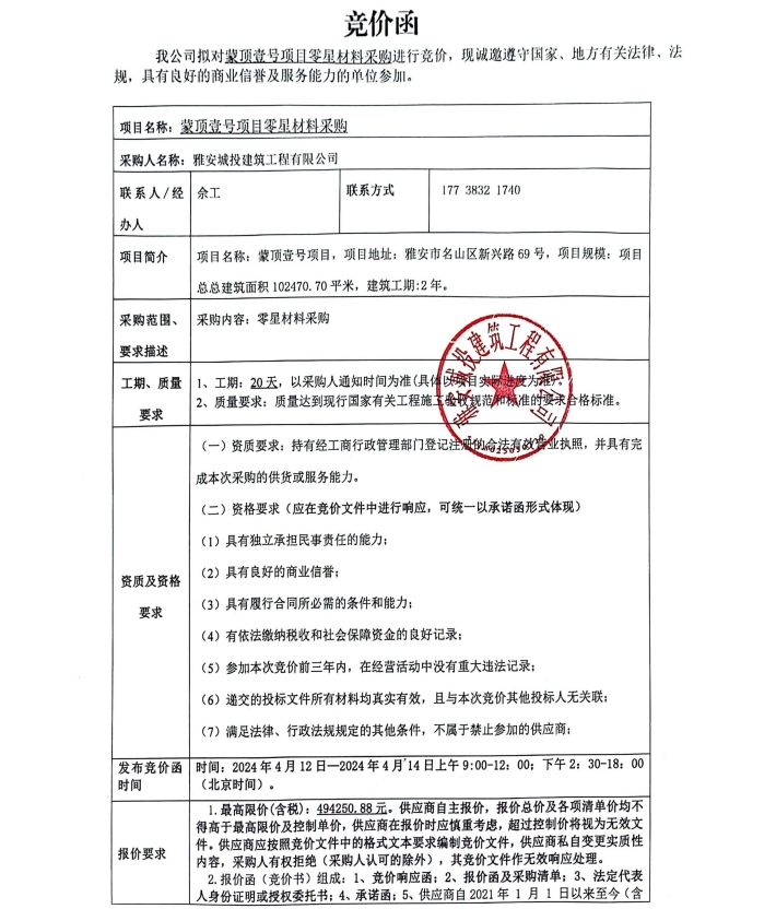 蒙頂壹號項(xiàng)目零星材料采購競價(jià)公告