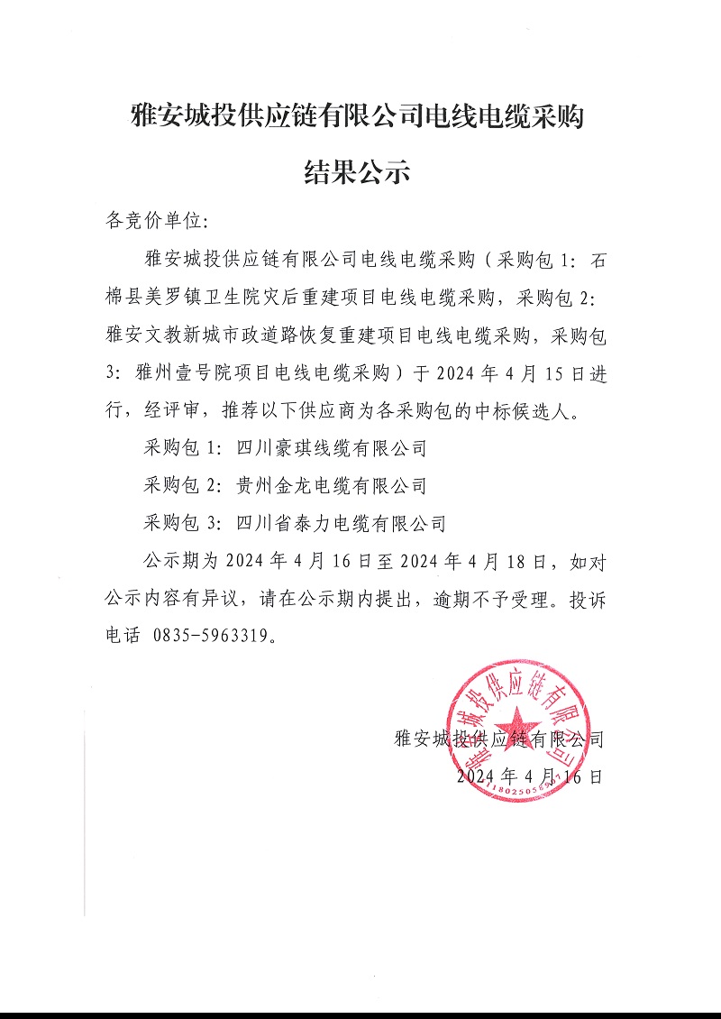 雅安城投供應(yīng)鏈有限公司電線電纜采購結(jié)果公示