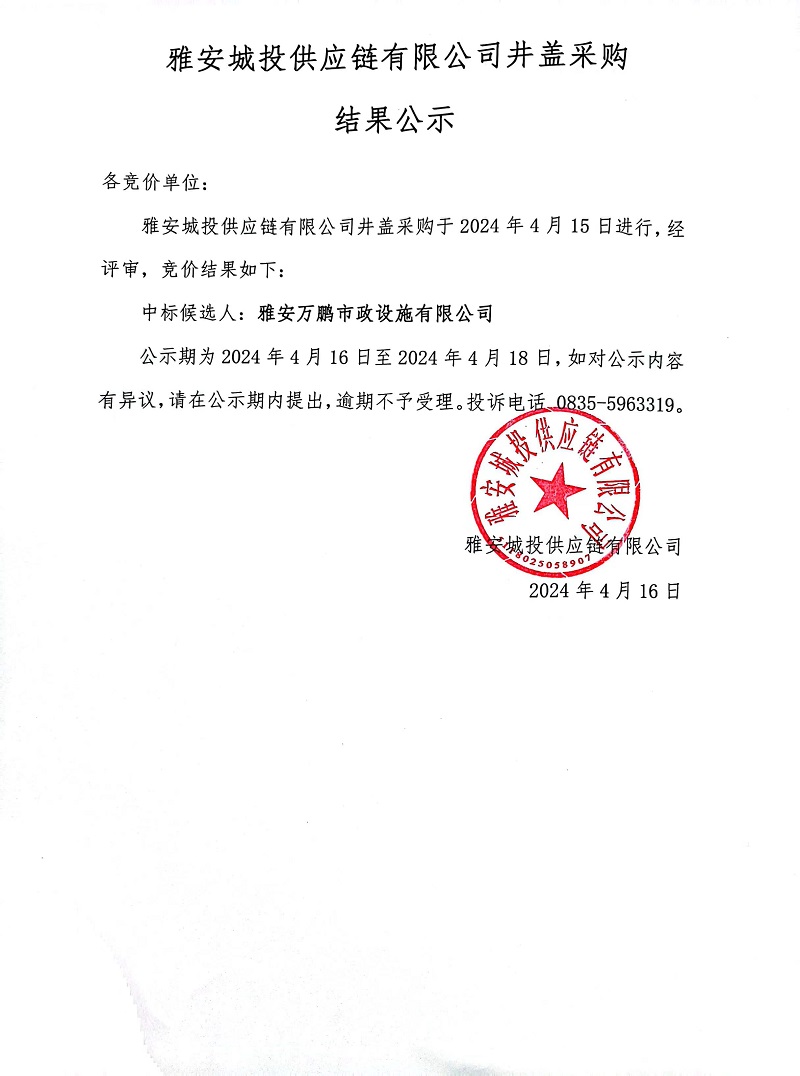 雅安城投供應(yīng)鏈有限公司井蓋采購結(jié)果公示
