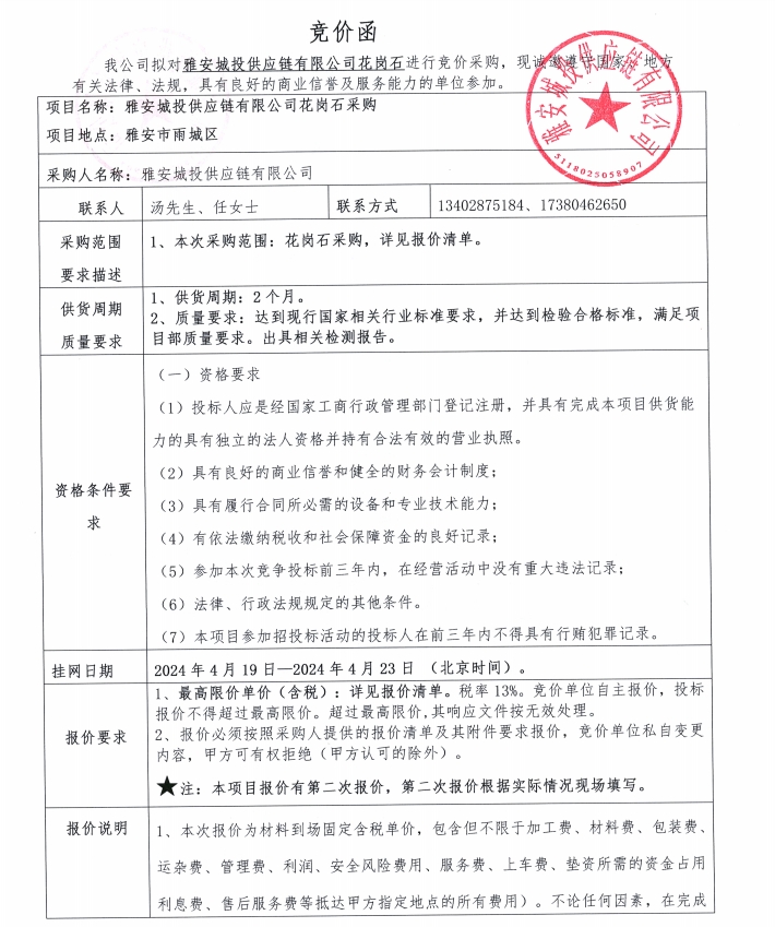雅安城投供應(yīng)鏈有限公司花崗石采購(gòu)競(jìng)價(jià)公告