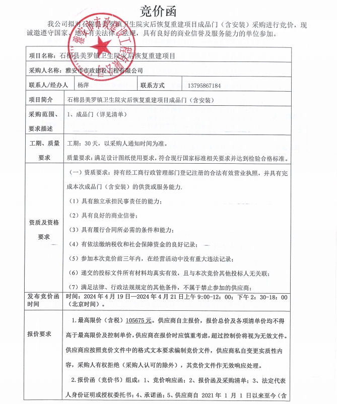 石棉縣美羅鎮(zhèn)衛(wèi)生院災(zāi)后恢復(fù)重建項目競價公告