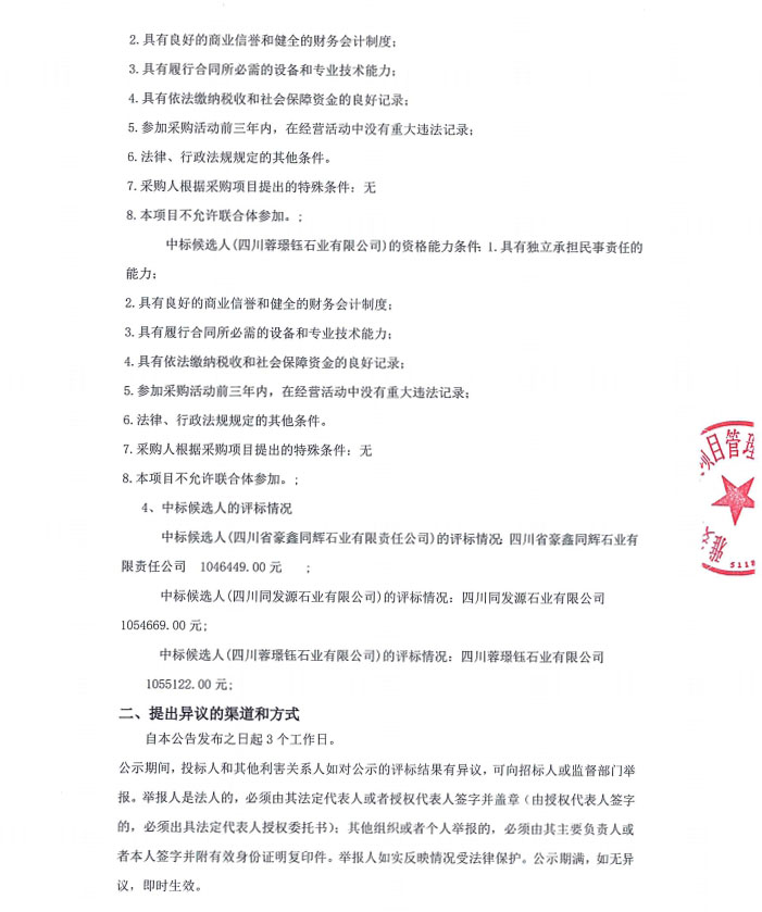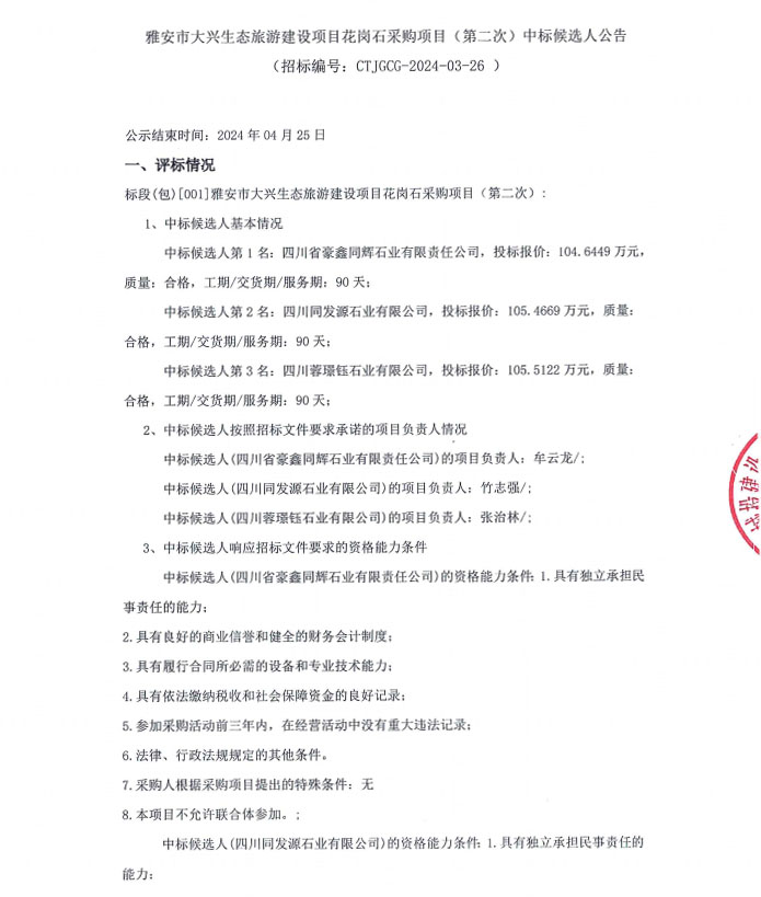 雅安市大興生態(tài)旅游建設(shè)項目花崗石采購項目(第二次)中標候選人公告