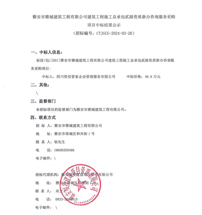 雅安市雅城建筑工程有限公司建筑工程施工總承包貳級(jí)資質(zhì)新辦咨詢服務(wù)采購(gòu)項(xiàng)目中標(biāo)結(jié)果公示