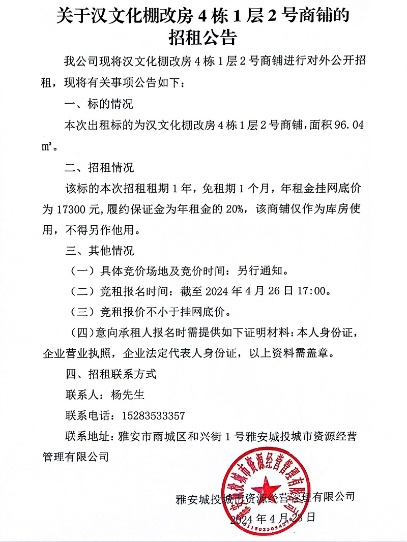 關(guān)于漢文化棚改房4棟1層2號商鋪的招租公告