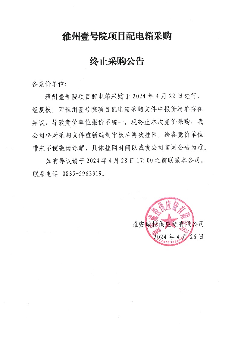 雅州壹號院項目配電箱采購終止采購公告