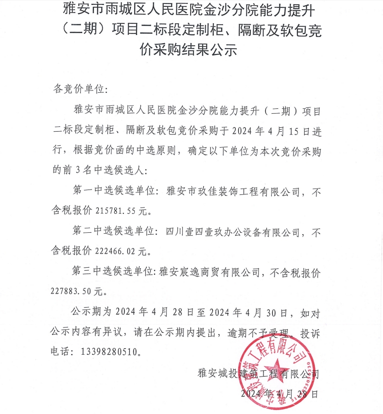 雅安市雨城區(qū)人民醫(yī)院金沙分院能力提升(二期)項目二標段定制柜、隔斷及軟包競價采購結果公示