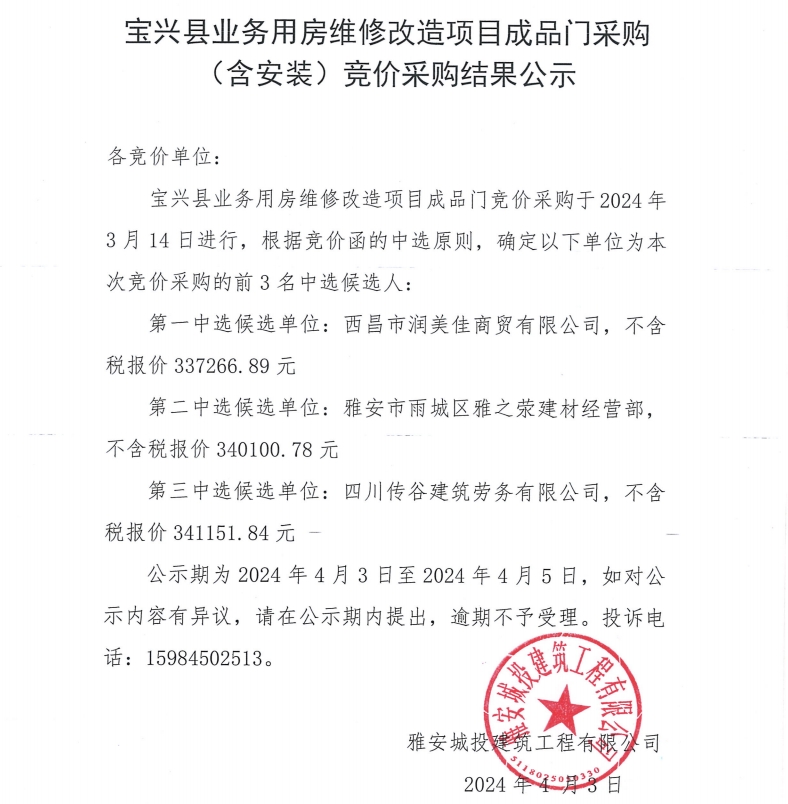 寶興縣業(yè)務(wù)用房維修改造項(xiàng)目成品門采購(gòu)(含安裝)競(jìng)價(jià)采購(gòu)結(jié)果公示
