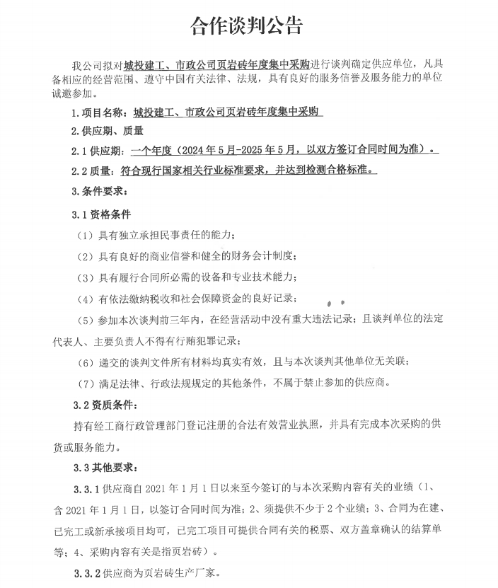 城投建工、市政公司頁(yè)巖磚年度集中采購(gòu)合作談判公告
