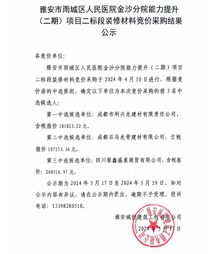 雅安市雨城區(qū)人民醫(yī)院金沙分院能力提升(二期)項目二標段裝修材料競價采購結(jié)果公示