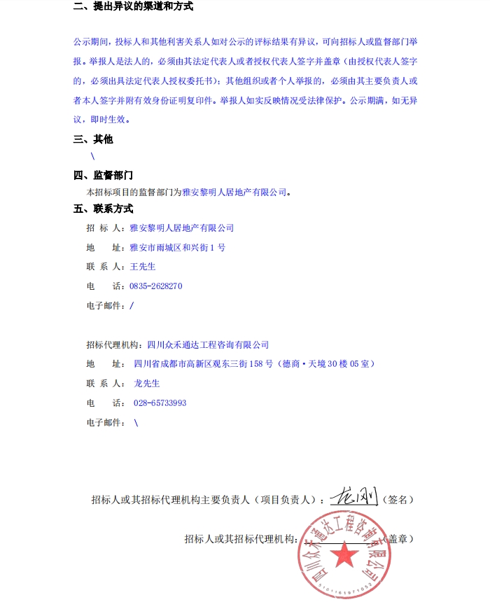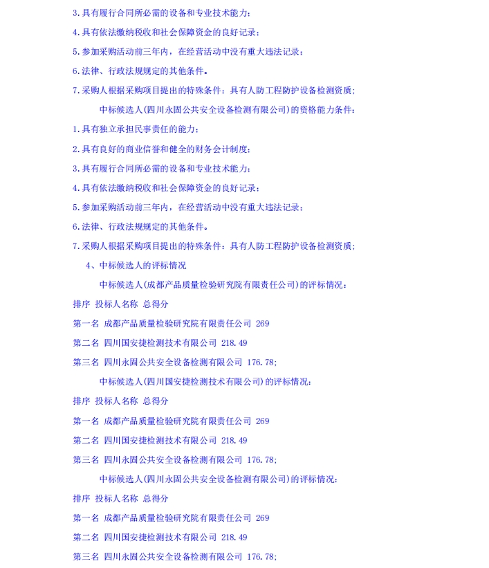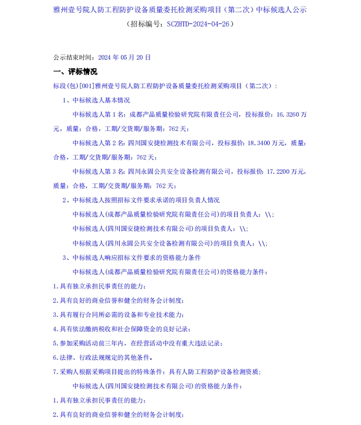雅州壹號院人防工程防護設備質量委托檢測采購項目(第二次)中標候選人公示
