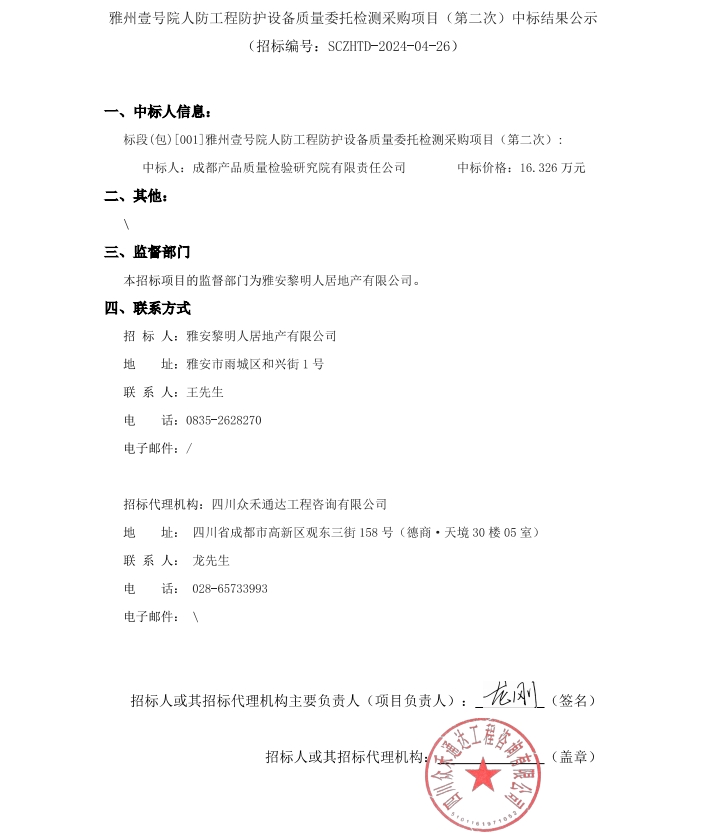 雅州壹號院人防工程防護設(shè)備質(zhì)量委托檢測采購項目(第二次)中標結(jié)果公示