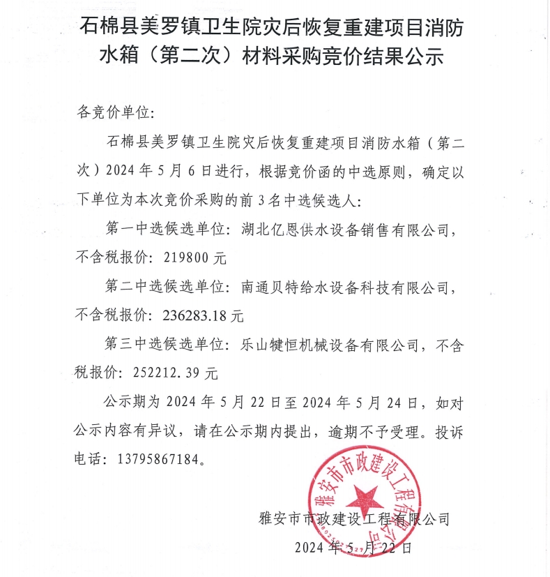 石棉縣美羅鎮(zhèn)衛(wèi)生院災(zāi)后恢復(fù)重建項(xiàng)目消防水箱(第二次)材料采購競價結(jié)果公示