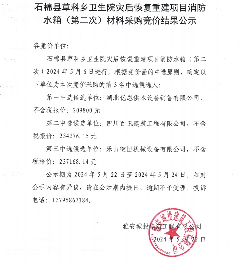 石棉縣草科鄉(xiāng)衛(wèi)生院災(zāi)后恢復(fù)重建項(xiàng)目消防水箱(第二次)材料采購競(jìng)價(jià)結(jié)果公示