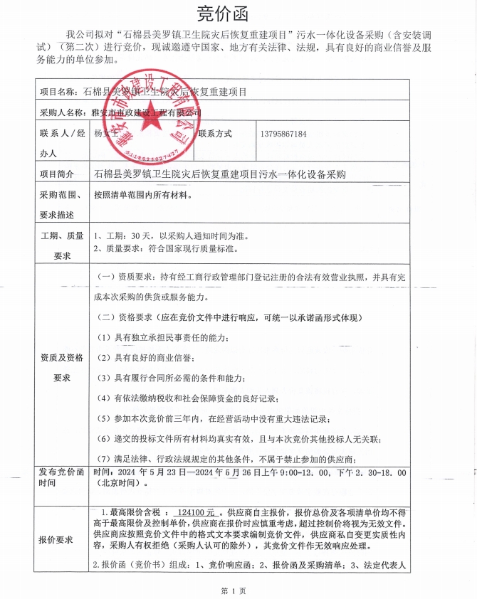 石棉縣美羅鎮(zhèn)衛(wèi)生院災(zāi)后恢復(fù)重建項目污水一體化設(shè)備材料采購(第二次)競價公告