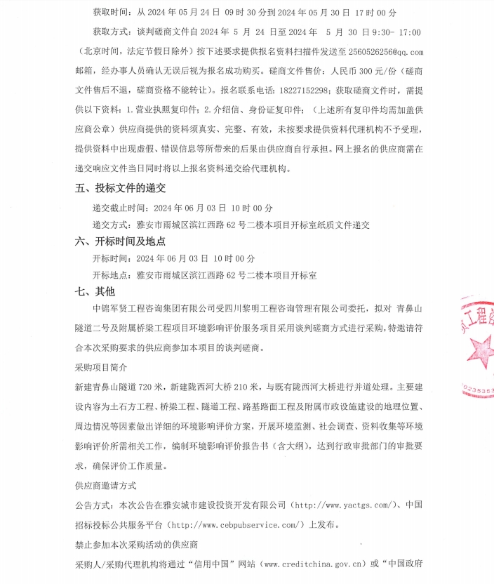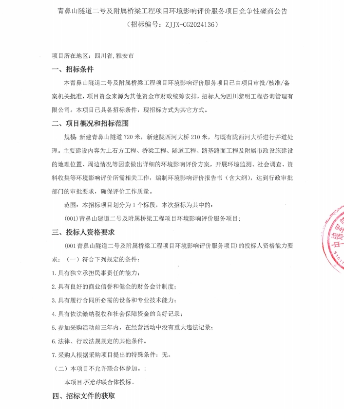 青鼻山隧道二號及附屬橋梁工程項目環(huán)境影響評價服務項目競爭性磋商公告