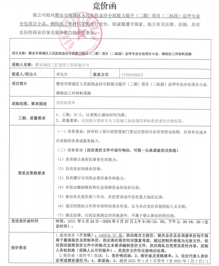 雅安市雨城區(qū)人民醫(yī)院金沙分院能力提升(二期)項目(二標段)總坪專業(yè)分包項目小品、鋼構(gòu)加工件材料采購競價公告