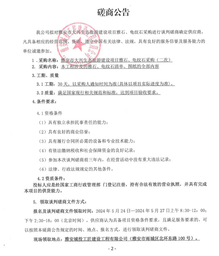 雅安市大興生態(tài)旅游建設(shè)項(xiàng)目雅石、龜紋石(二次)采購(gòu)(第二次)磋商公告