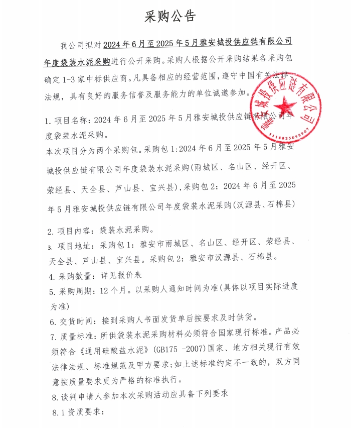 2024年6月至2025年5月雅安城投供應(yīng)鏈有限公司年度袋裝水泥采購公告