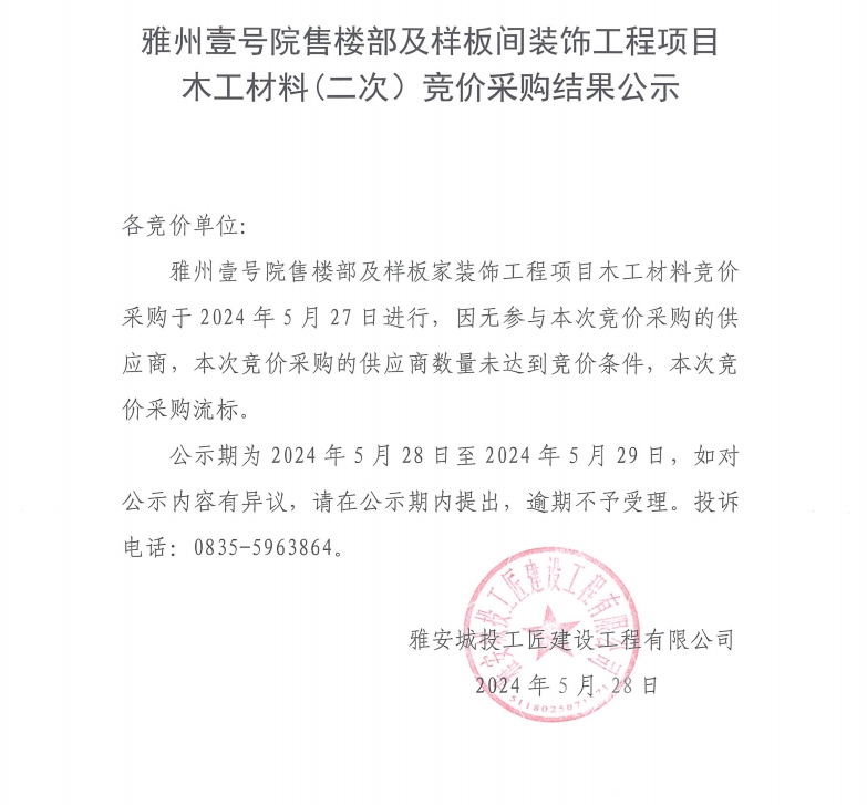 雅州壹號院售樓部及樣板間裝飾工程項目木工材料(二次)競價采購結果公示