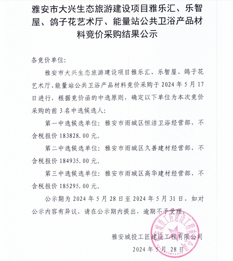 雅安市大興生態(tài)旅游建設(shè)項(xiàng)目雅樂匯、樂智屋、鴿子花藝術(shù)廳、能量站公共衛(wèi)浴材料競(jìng)價(jià)采購結(jié)果公示