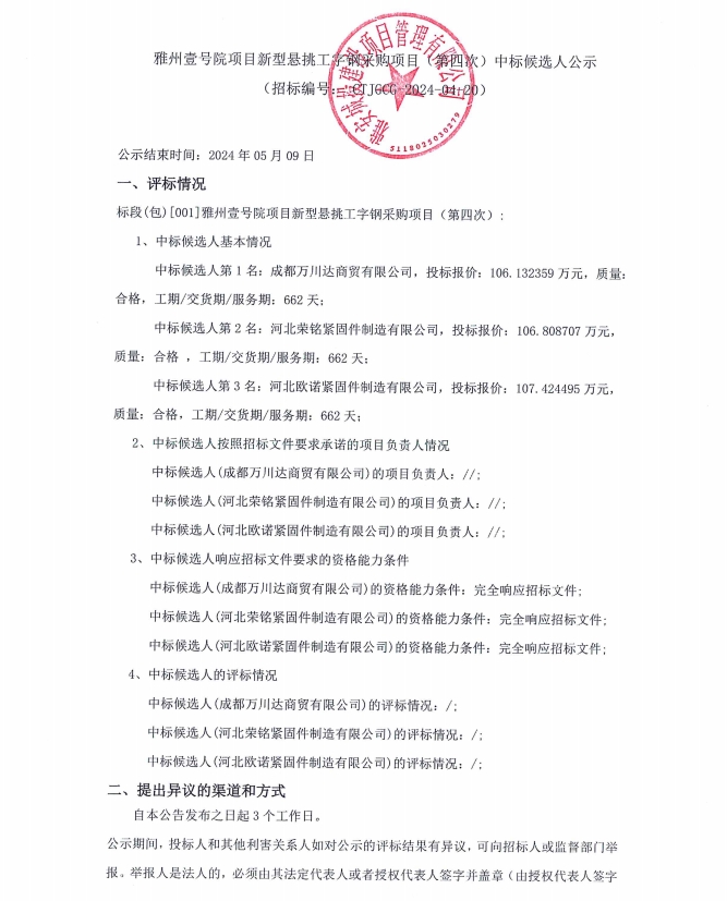 雅州壹號(hào)院項(xiàng)目新型懸挑工字鋼采購項(xiàng)目(第四次)中標(biāo)候選人公示