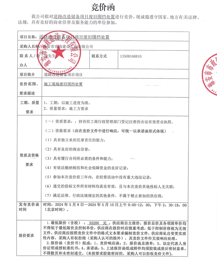道路改造儲備項(xiàng)目廢舊圍擋處置競價公告