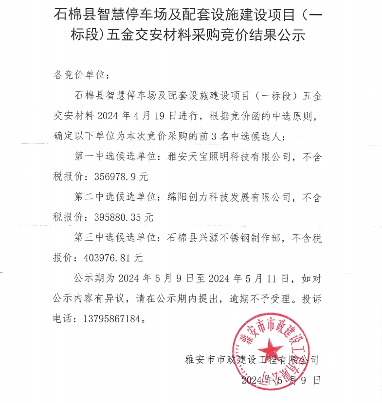 石棉縣智慧停車(chē)場(chǎng)及配套設(shè)施建設(shè)項(xiàng)目(一標(biāo)段)五金交安材料采購(gòu)競(jìng)價(jià)結(jié)果公示