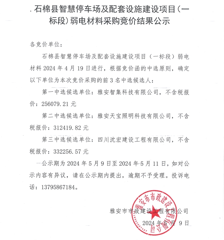 石棉縣智慧停車場及配套設(shè)備建設(shè)項目(一標(biāo)段)弱電材料采購競價結(jié)果公示