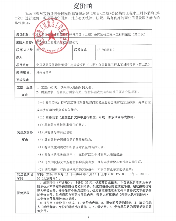 寶興縣靈關(guān)保障性租賃住房建設(shè)項目(二期)公區(qū)裝修工程木工材料采購(第二次)競價公告