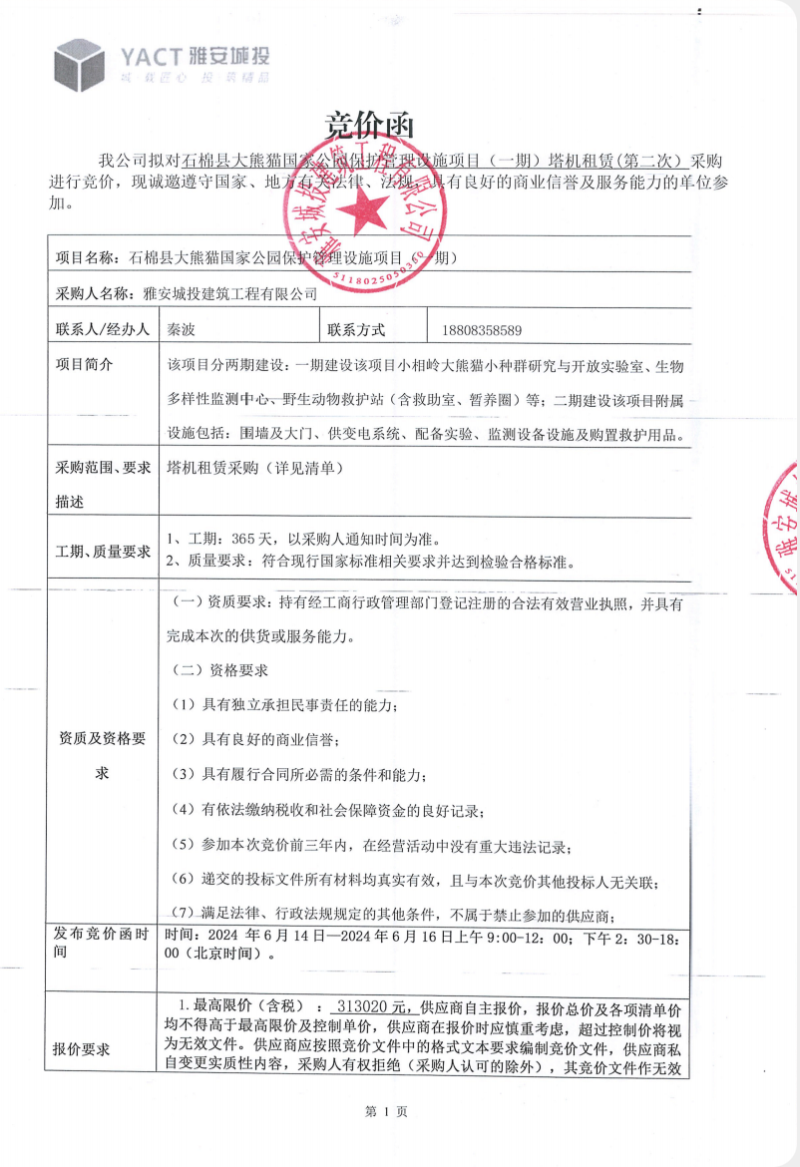 石棉縣大熊貓國(guó)家公園保護(hù)管理設(shè)施項(xiàng)目(一期)塔機(jī)租賃(第二次)競(jìng)價(jià)公告