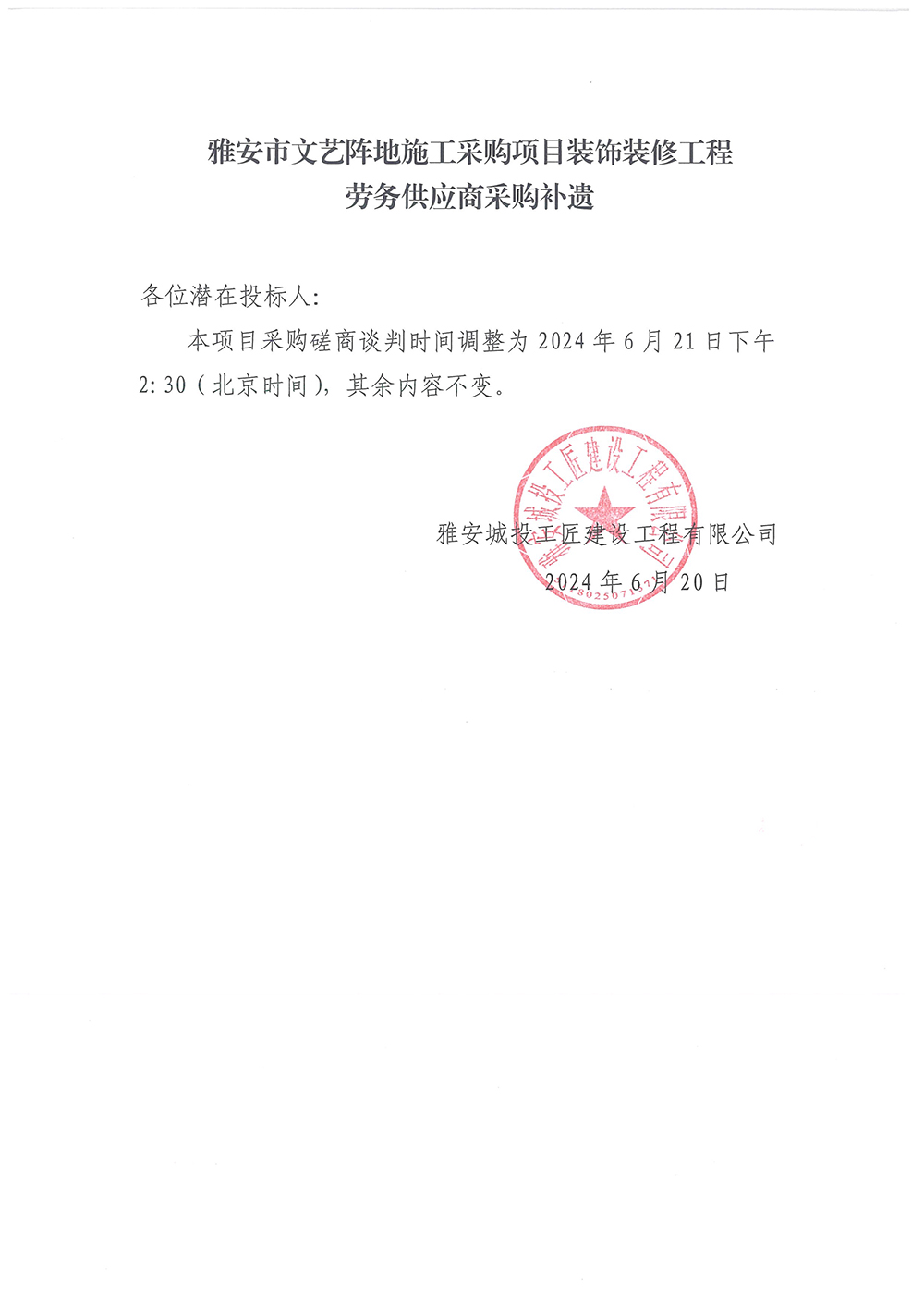 雅安市文藝陣地施工采購(gòu)項(xiàng)目裝飾裝修工程勞務(wù)供應(yīng)商采購(gòu)補(bǔ)遺