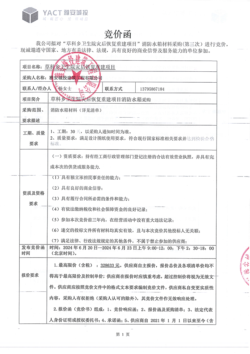 草科鄉(xiāng)衛(wèi)生院災后恢復重建項目消防水箱(第三次)采購競價函