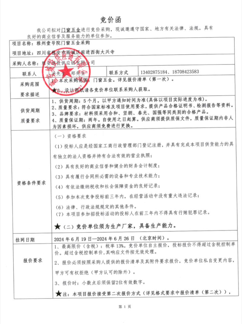 響應(yīng)文件格式-雅州壹號院門窗五金采購