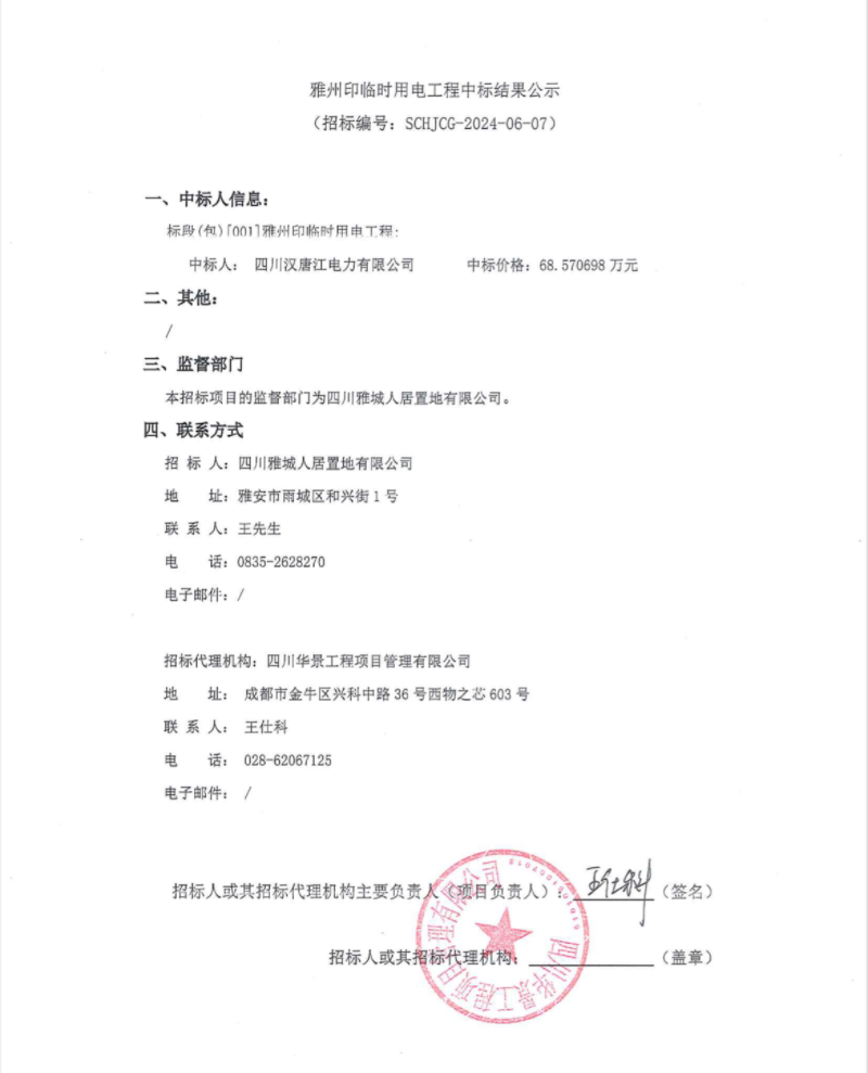雅州印臨時用電工程中標結(jié)果公示