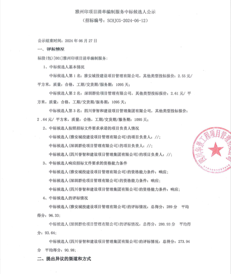 雅州印項目清單編制服務中標候選人公示