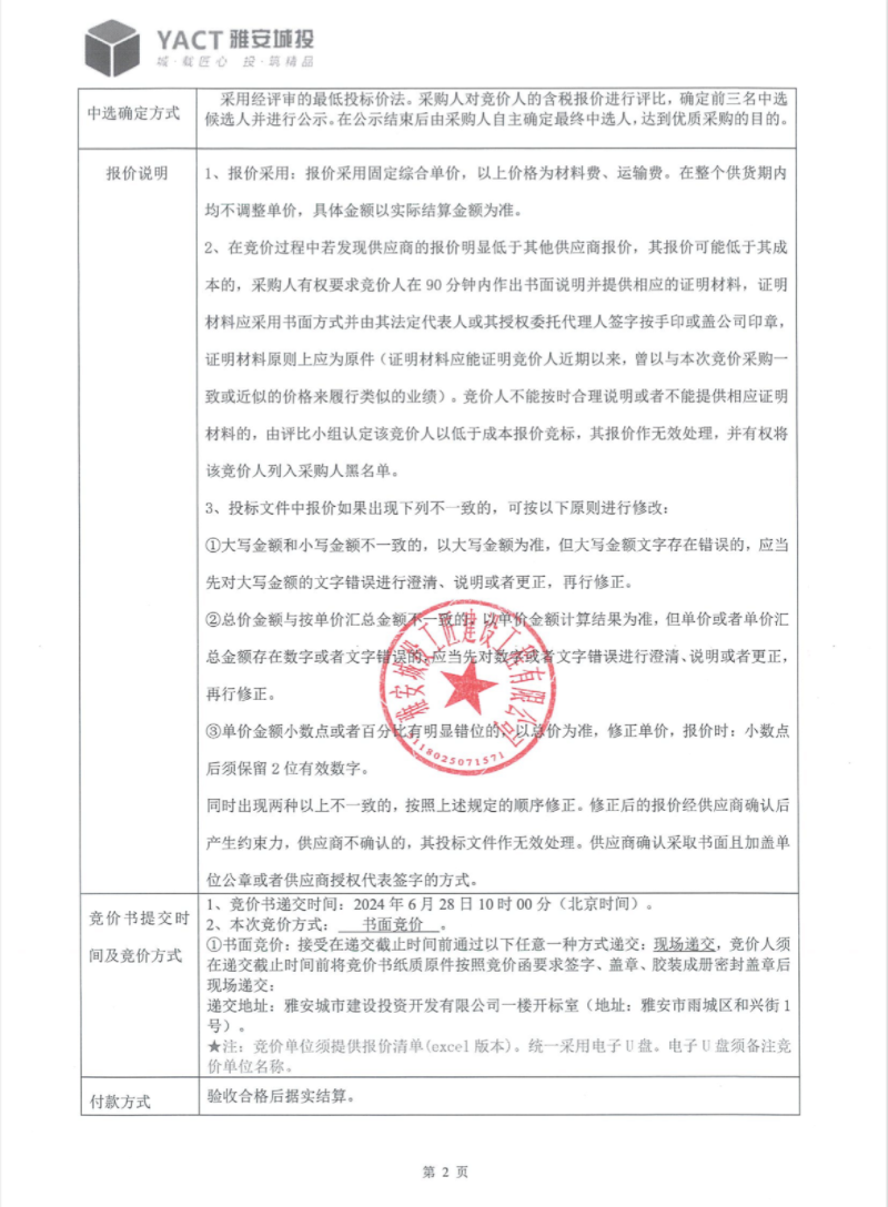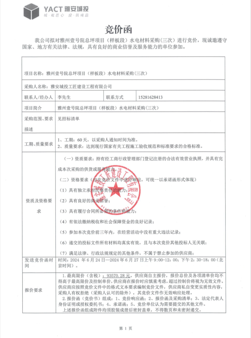 雅州壹號院總坪項(xiàng)目(樣板段)水電材料采購(三次)競價(jià)公告
