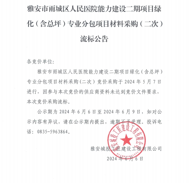 雅安市雨城區(qū)人民醫(yī)院能力建設(shè)二期項(xiàng)目綠化(含總坪)專(zhuān)業(yè)分包材料采購(gòu)(二次)流標(biāo)公告