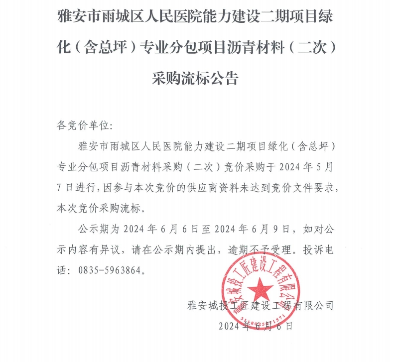 雅安市雨城區(qū)人民醫(yī)院能力建設(shè)二期項目綠化(含總坪)專業(yè)分包項目瀝青材料(二次)采購流標(biāo)公告