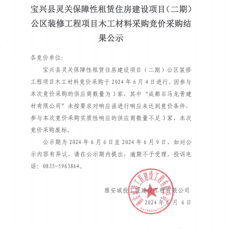 寶興縣靈關(guān)保障性租賃住房建設(shè)項(xiàng)目(二期)公區(qū)裝修工程項(xiàng)目木工材料采購競價采購結(jié)果公示