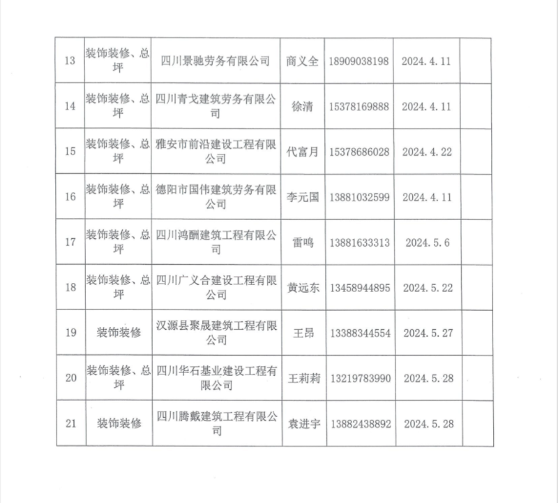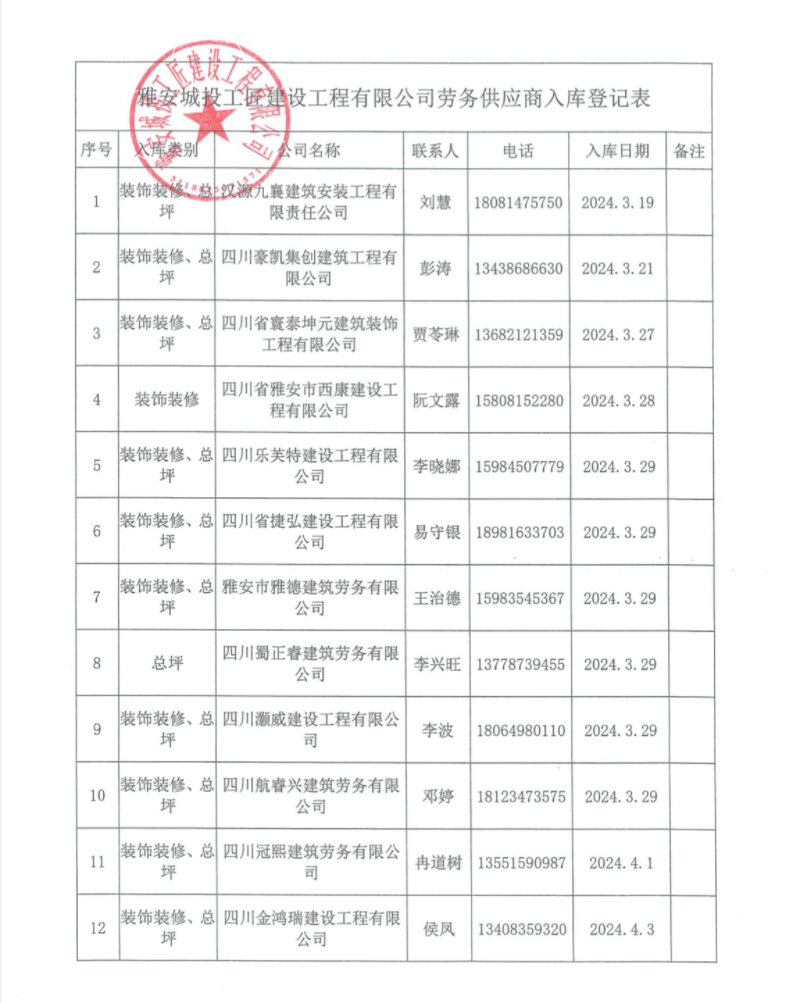 雅安城投工匠建設(shè)工程有限公司勞務(wù)供應(yīng)商入庫登記表