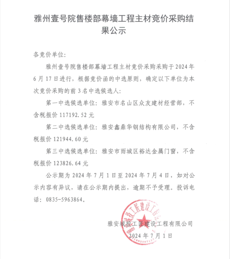 雅州壹號(hào)院售樓部幕墻工程主材競(jìng)價(jià)采購(gòu)結(jié)果公示