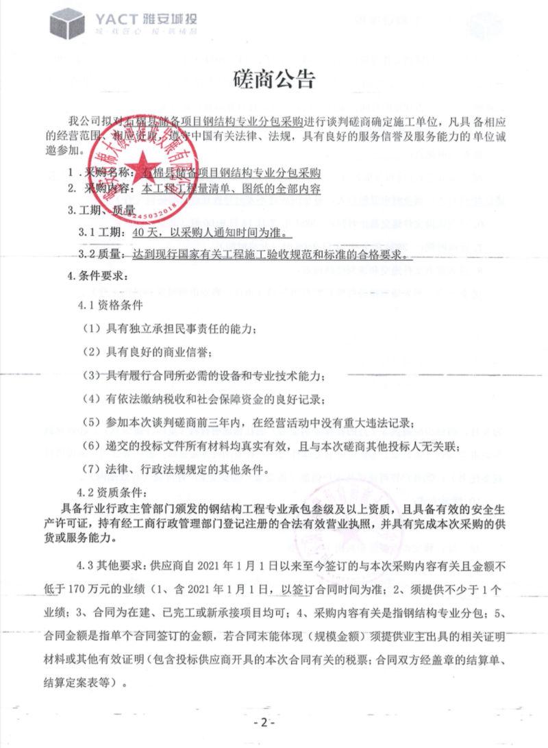 石棉縣儲備項目鋼結構專業(yè)分包采購談判磋商公告