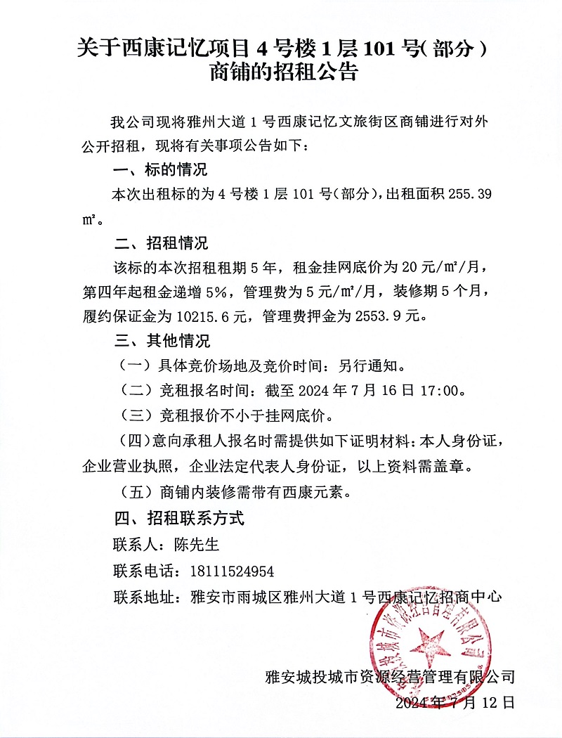 關(guān)于西康記憶項(xiàng)目4號樓1層101號(部分)商鋪的招租公告