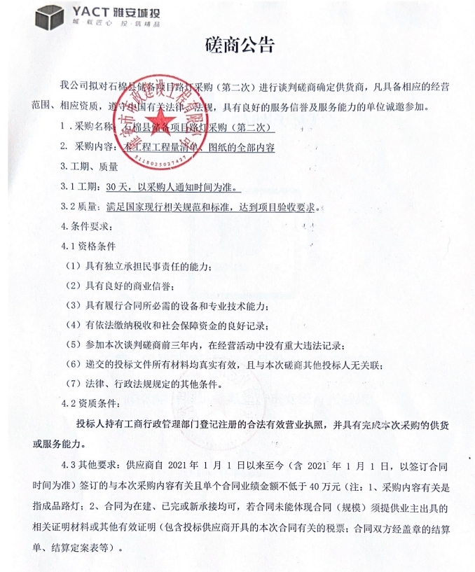 石棉縣儲(chǔ)備項(xiàng)目路燈采購(gòu)(第二次)磋商公告
