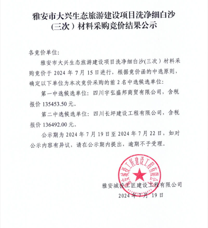 雅安市大興生態(tài)旅游建設(shè)項目洗凈細白沙(三次)材料采購競價結(jié)果公示