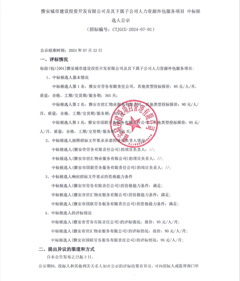 雅安城市建設(shè)投資開(kāi)發(fā)有限公司及其下屬子公司人力資源外包服務(wù)項(xiàng)目中標(biāo)候選人公示